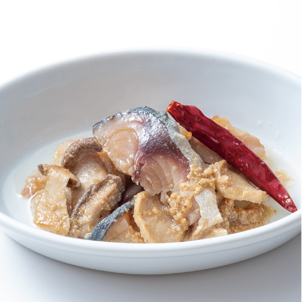 醸されてうま味が溢れる「へしこ」とエリンギ、ピリッと効いた唐辛子がやみつきになる米油漬けです。「へしこ」は塩鯖のぬか漬けのこと。鯖のうま味が詰まった"ぬか"が隠し味です。